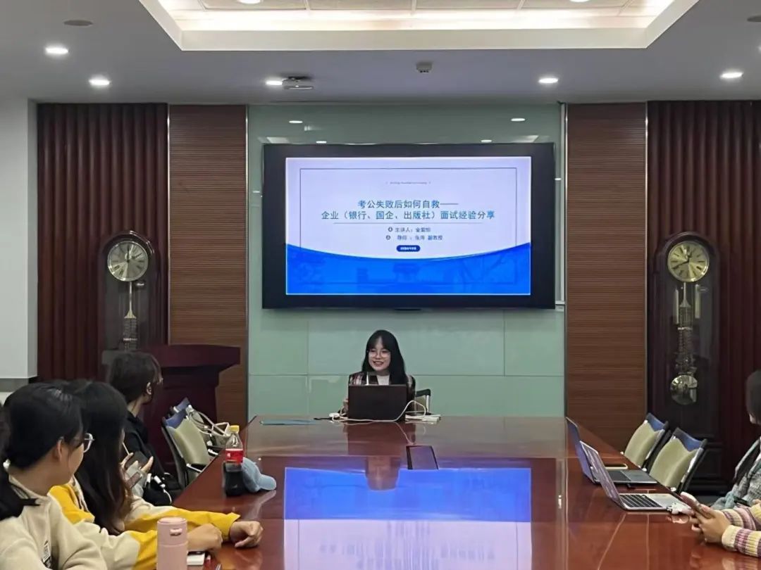 然后,金紫怡同志结合自身在出版社、科研院所和生物私企、银行的面试经历和心得体会,深入浅出地介绍了各单位工作特性和需求特质、面试的提问内容以及现场突发状况的应对等,让各位同志对企业面试的流程与特点有了初步认知。
