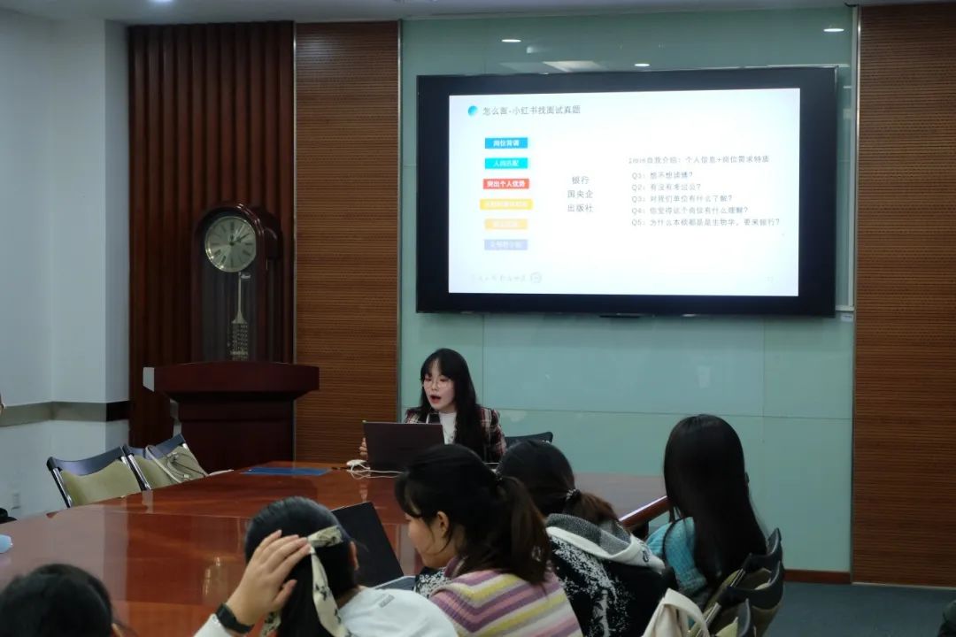 金紫怡同志还为大家带来了“求职加油包”,让各位同志认识到,校内也有各种资源为同学们的求职提供了便利,比如可以用于笔试的图书馆研究间、学院会议室,用于面试的校、院级面试间,在求职期间也可以向校级/院级就业咨询导师、雪绒花心理咨询中心寻求帮助。