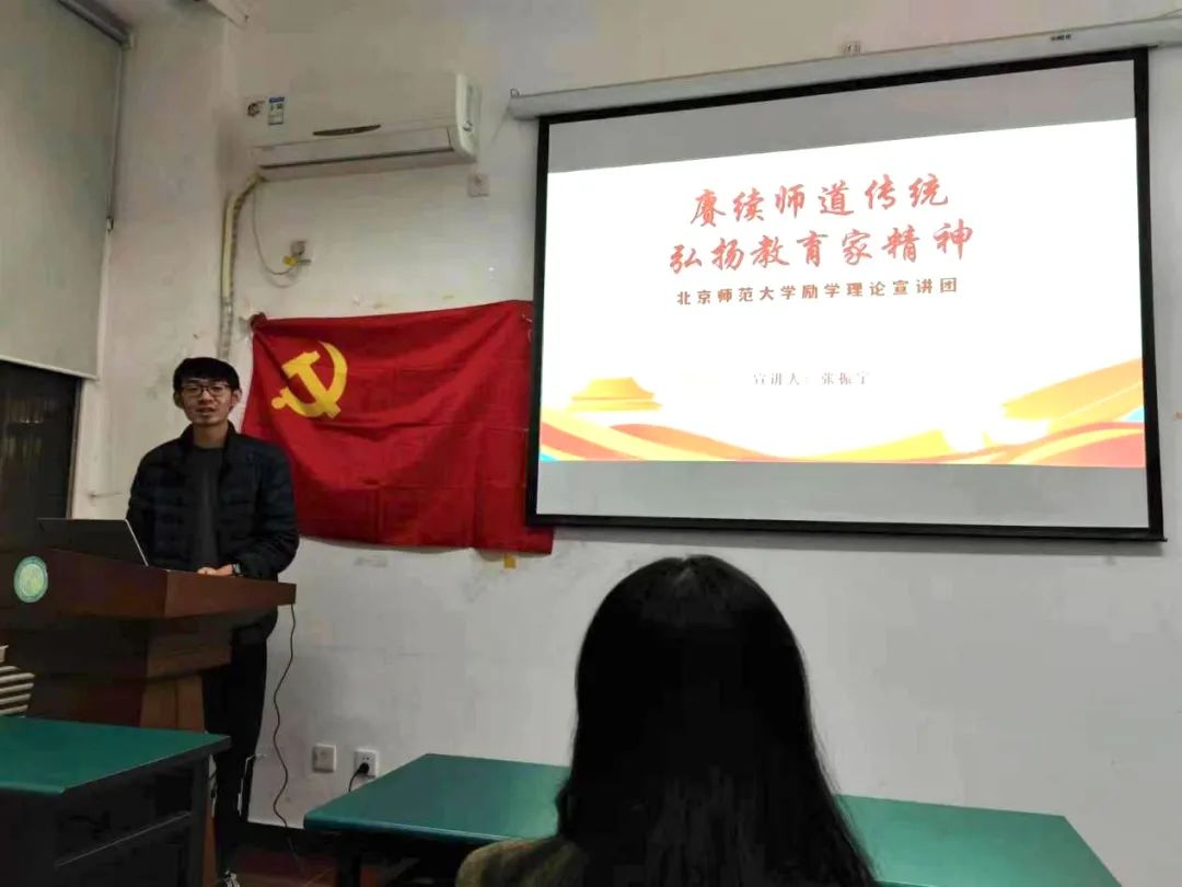 伟德国际1946bv官网励学理论宣讲团成员张振宁同学带来了题为《赓续师道传统,弘扬教育家精神》的精彩宣讲。张振宁同志在“传承精神,引领未来”的主题下,深情讲述了王梓坤老校长为提升教师地位、倡导尊师重教风尚所做出的努力,以及陈垣老校长爱国爱教育的崇高精神。他鼓励在场的同学们继承和发扬励耘精神、红专并进,以习近平总书记的讲话为指导,努力成为有理想信念、有道德情操、有扎实知识、有仁爱之心的“四有”好老师,为发展具有中国特色、世界水平的现代教育贡献力量。