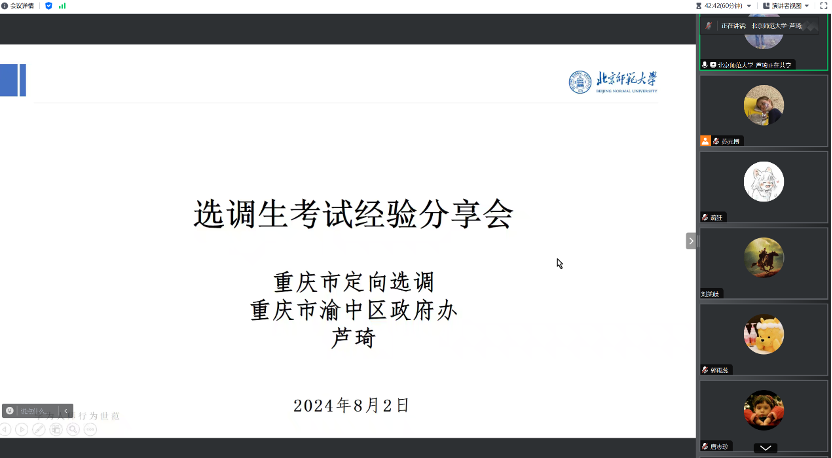 2022级博士党支部立足党建业务相融合,服务学科建设,服务社会需求,服务国家战略,2022级博士党支部搭建同顶尖学者、优秀学生交流学习平台,探索党建引领科研与就业的创新路径,举办“薪火相传 生生不息”系列讲座。为助力同学们实现更加充分的高质量就业,伟德国际1946bv官网2022级博士党支部于2024年8月2日举办“薪火相传 生生不息”之选调经验分享会,邀请在今年选调生考试中取得卓越成绩的优秀毕业生唐志珍和芦琦,亲述选调生考试的最新考情、职位选择、备考方法等方面的宝贵经验,讲座面向学院全体学生。