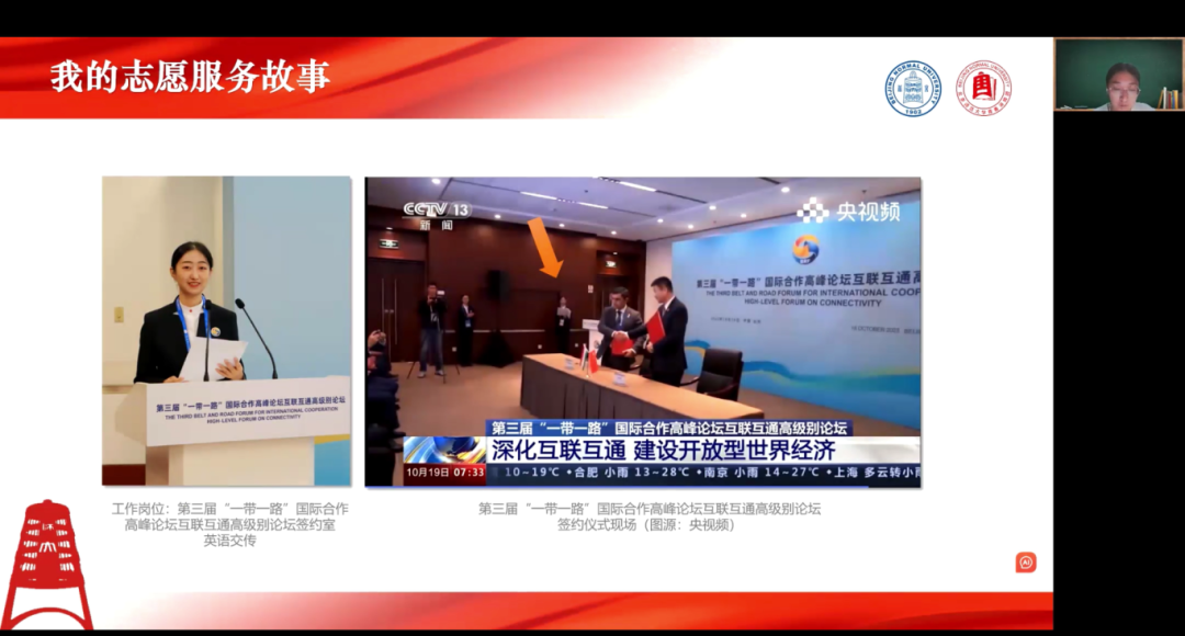 郎玮同志的微党课主题是《走近“一带一路”——让世界听见中国声音》,从一份主持稿、两本白皮书和上百套设备三个切入点入手,分享了其在第三届一带一路国际合作高峰论坛的一段宝贵又深刻的志愿服务经历。朗玮生动地讲述了自己在英语交传岗位上的挑战与成长。她详细描述了准备过程中的困难与努力,包括翻译主持稿、学习专业术语、熟悉外宾名字等,并强调了与团队协作的重要性。最终,郎玮和团队成功地在国际舞台上传递了中国声音,见证了“一带一路”倡议的国际影响力。
