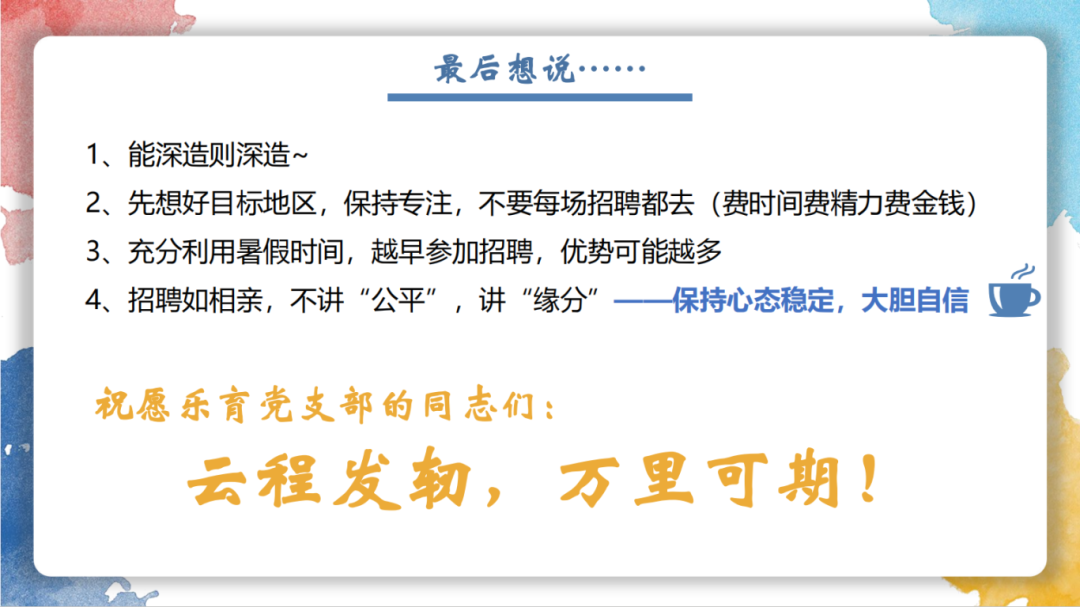 谭铭霞同志的分享主题为“教师招聘”。首先,她结合自身经验,分享了自身深入思考职业选择的过程,以及在招聘前应做好何种准备。随后,她详细介绍了获取招聘信息方式和渠道。在简历制作和面试准备方面,她分享了实用的技巧和策略,如要学会包装自己、准备不同时长的自我介绍等。另外,她还简要介绍了笔试和面试的准备方法。谭铭霞同志的分享不仅为各位同志提供了实用的求职技巧,也给各位同志在生涯规划上带来了进一步的启发与思考。