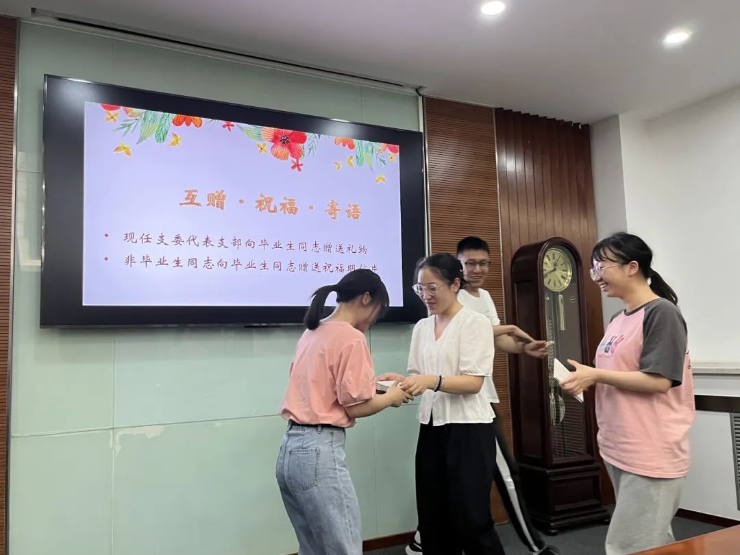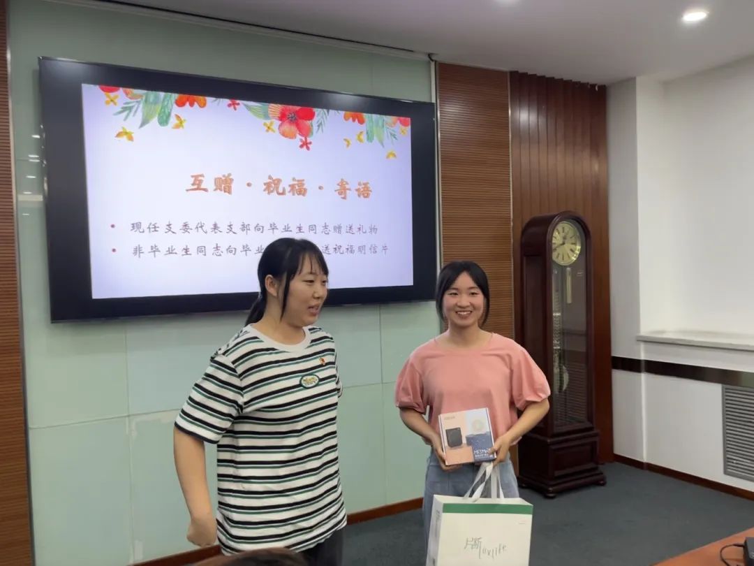 首先,支部书记王纪阳同志代表支部给两位毕业生同志赠送礼物,感谢她们对支部的付出和对支部内其他同志的帮助。