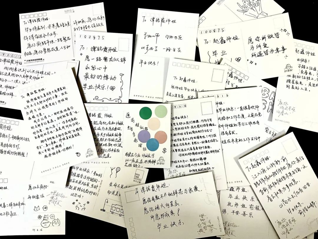 支部全体同志一起为毕业生党员同志书写祝福明信片,字里行间传递着对两位师姐的感谢与美好祝愿,最后由党小组长将明信片赠予两位同志。