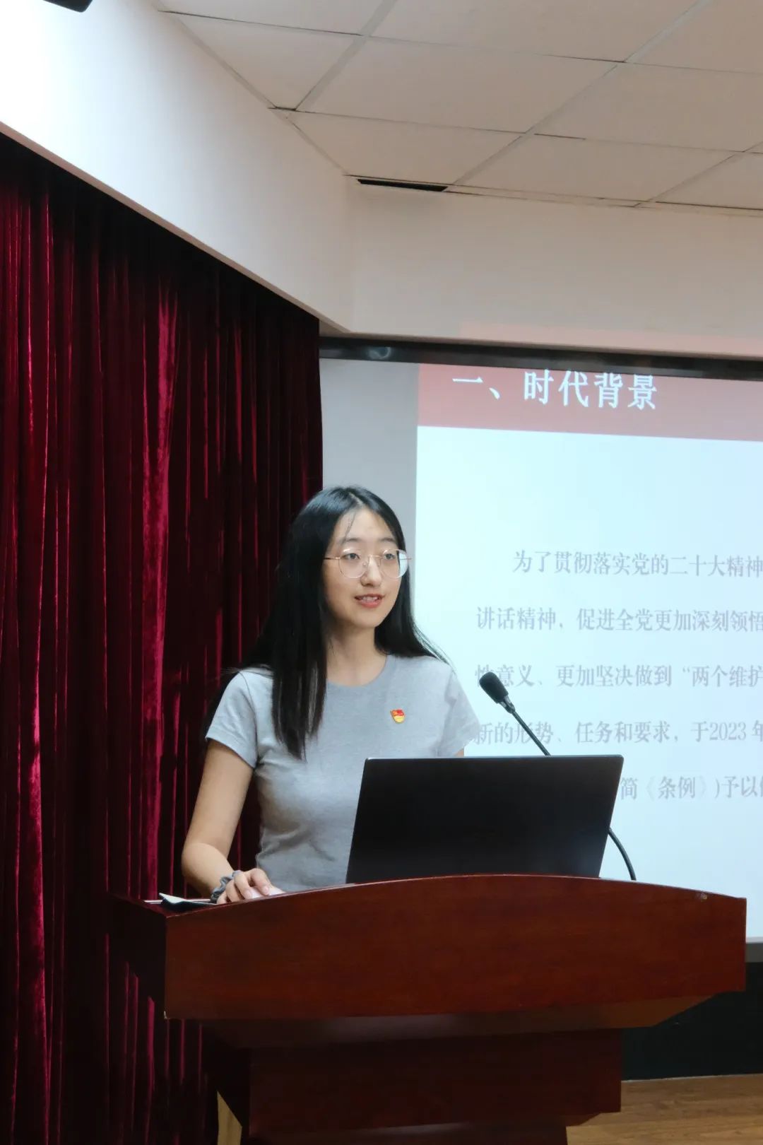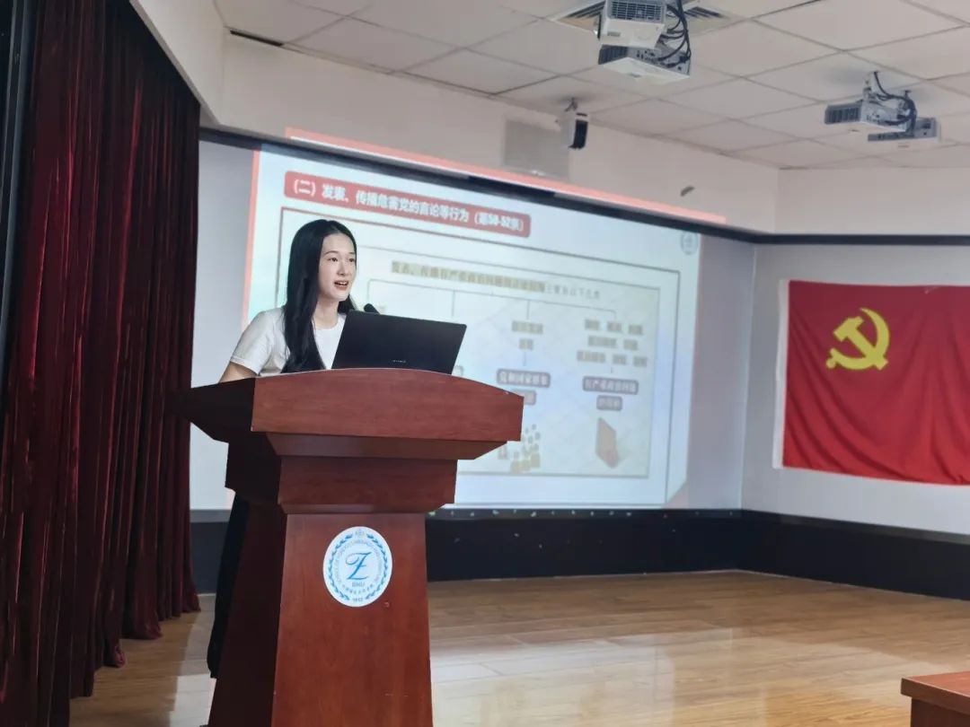 围绕主题“‘学纪知纪明纪守纪’:领会《条例》修订的意义及亮点”,外文学院博学党支部书记郎玮同志介绍了《条例》修订的时代背景及其四大主要意义,外文学院厚德党支部书记张馨予同志介绍了《条例》中总则、分则、附则的修订概况及亮点所在。