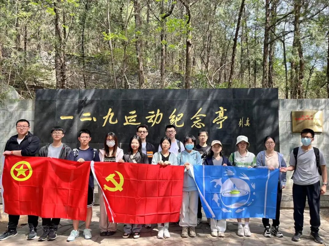 一二·九运动纪念亭位于北京海淀区寿安山西麓、卧佛寺西北樱桃沟内,为纪念“一二·九”学习抗日爱国运动而建立。2024年4月20日上午9时,笃行党支部与2023级生态学硕士团支部共同组织15名党员与团员共同来到北京西郊的国家植物园樱桃沟,寻访“一二·九”运动纪念亭,铭记抗战历史,缅怀革命先烈。