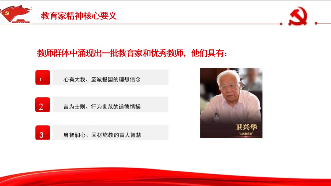 通过对教育家和优秀教师案例的学习,我们了解到教育家精神内涵可以从“报国”、“育人”、“弘道”这三方面来理解。三个关键词,体现着教育家的风骨和神采。每一位教育家都要在教书育人实践中,在个人的生命体悟中,觉醒自身的文化使命,校准自己的精神坐标。