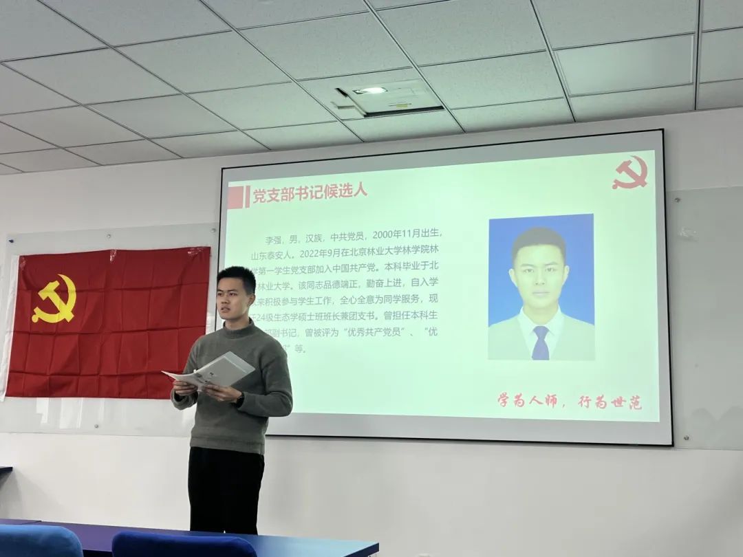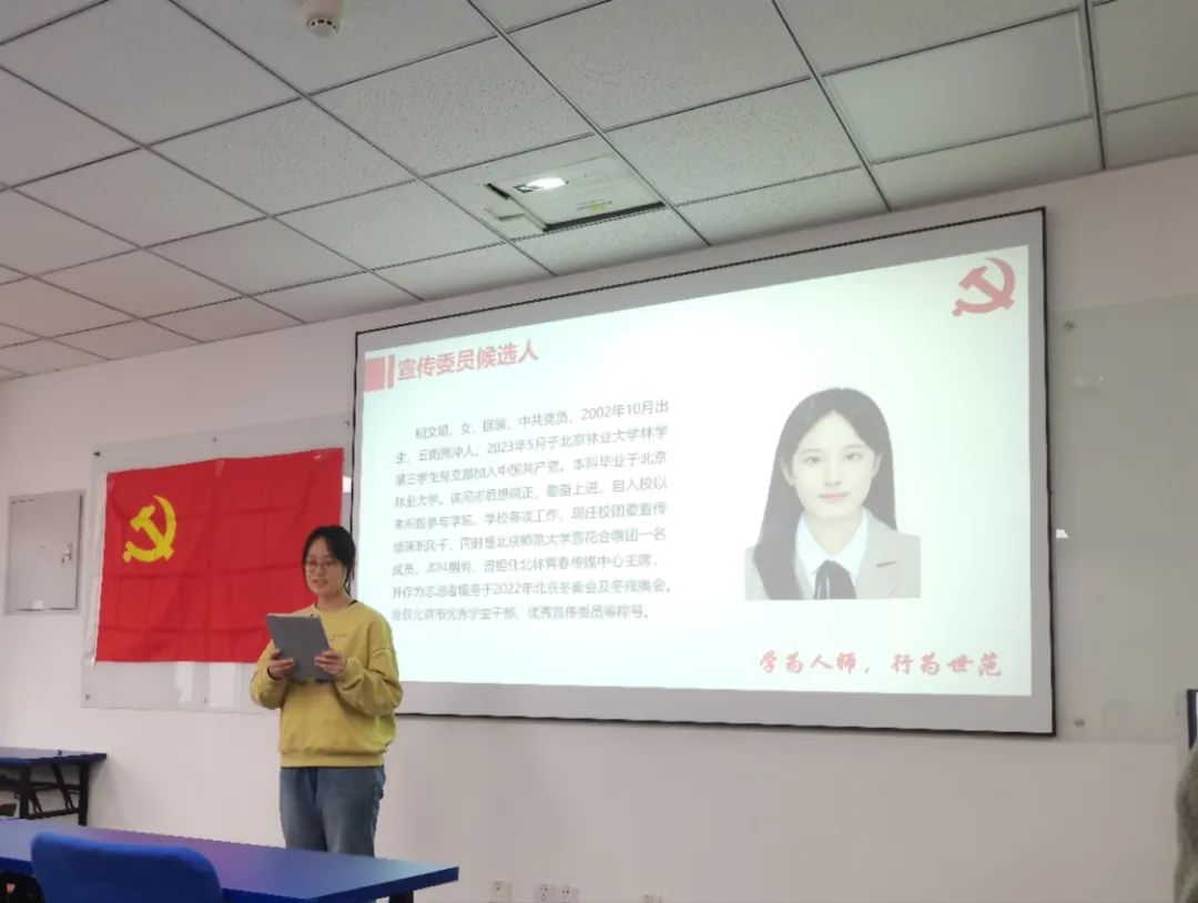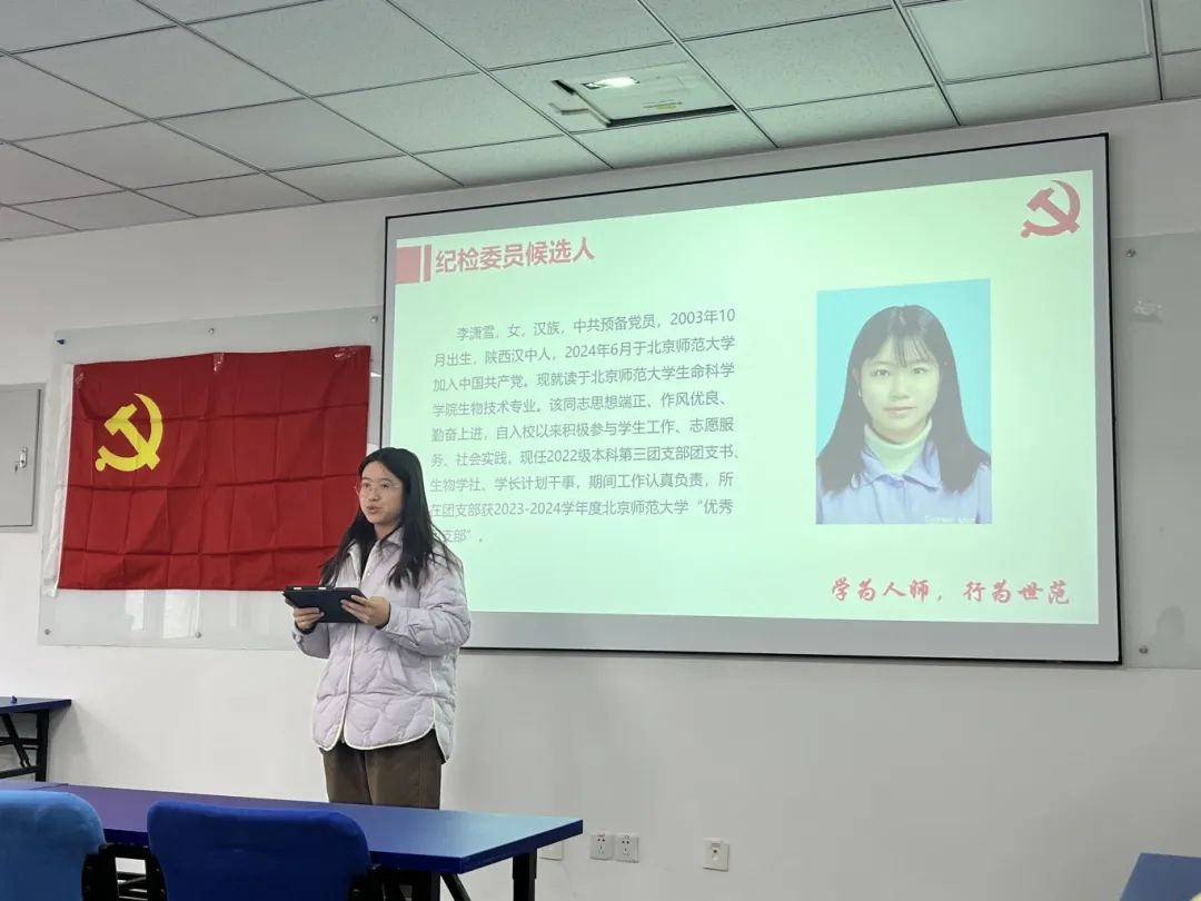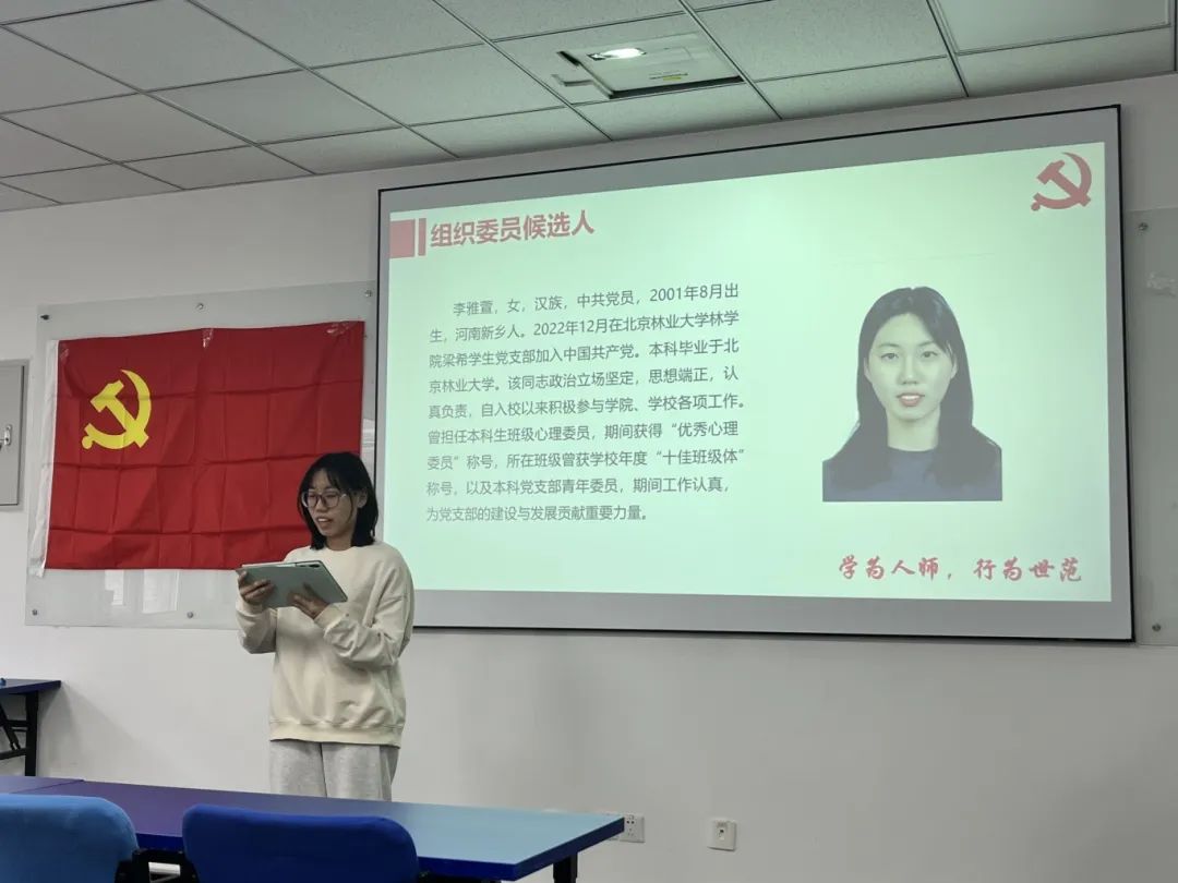 贾康宁同志依次介绍了支部书记候选人李强,组织委员候选人李雅萱,宣传委员明文珺及纪检委员李潇雪的基本情况。