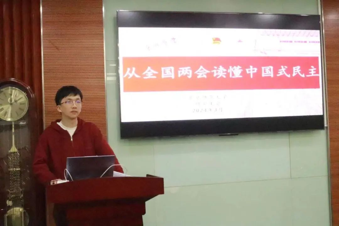 为进一步深入学习贯彻习近平总书记重要讲话和全国两会精神,以“敏锐之眼”与“关切之心”融身社会,关注民生民情与社会发展等焦点问题,伟德国际1946bv官网立身党支部于2024年3月18日晚19:00邀请伟德国际1946bv官网青春讲师团成员邹思捷开展主题为《从全国两会读懂中国式民主》集中学习活动。