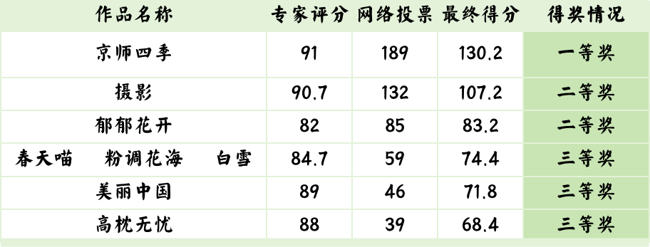 活动邀请专家评委对参赛作品打分,同时进行网络投票,最终得分由两部分组成,专家评分占60%,网络投票占40%,经投票,活动共评出一等奖2名、二等奖4名、三等奖6名、参与奖若干。让我们恭喜各位参赛选手!