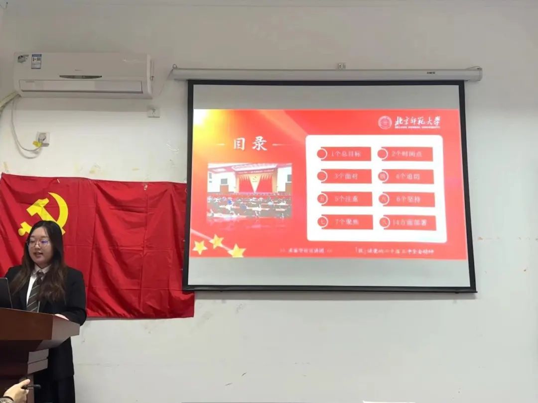 会议第一项,求索宣讲团樊亦聪同学进行《“数”读党的二十届三中全会精神》主题宣讲,为支部成员详细讲解党的二十届三中全会的精神实质和深远影响。