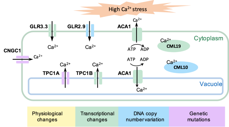 结合比较基因组学,种群基因组学和转录组学的证据,进一步对圆果化香树适应喀斯特生境的分子机制展开研究。首先,基因家族的收缩扩张分析发现,相比于化香,钙离子结合蛋白CML10,谷氨酸受体蛋白GLR2.9,以及热休克蛋白70 kDa等与钙离子浓度调节相关的通路基因在圆果化香树中显著扩张(图3)。其次,全基因组水平的选择扫描分析检测到包括TPC1A(位于液泡膜的钙离子内流通道)在内的多个与钙离子浓度调节相关的基因在圆果化香树中受到强烈的正选择(图3)。事实上,在喀斯特生境生存的草本植物报春苣苔的研究中,也发现TPC1基因受到强烈的正选择,表明木本植物圆果化香树和草本植物报春苣苔两个远缘类群,在适应喀斯特生境的过程中,发生了趋同适应。最后,转录组层面的差异表达分析发现,圆果化香树在钙调蛋白CML 19,钙离子通道GLR 3.3和Ca2+-ATPase 1等基因的表达量显著高于同域分布的化香树,实验室高钙、镁胁迫处理后的圆果化香树幼苗也表现出比化香树更高的适应潜力(图3)。本研究为适应的接力赛假说提供了分子数据支持,并指出 TPC1作为潜在的适应喀斯特生境的关键基因,在木本和草本植物中发生了基因水平的趋同进化。