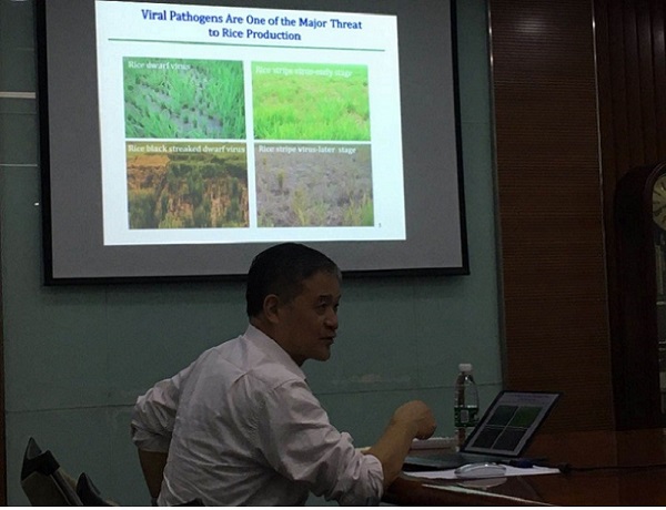 李毅教授以“水稻抗病毒研究进展”为题,报告了茉莉酸信号和水稻抗病毒免疫中RNA沉默途径之间的调控网络,详细地介绍了茉莉酸(JA)信号正调控水稻的抗病毒防御、JA信号传导和RNA沉默协同促进水稻抗病毒防御、JAMYB是调节AGO18表达的JA响应转录因子、水稻条纹病毒外壳蛋白(CP)触发JA-AGO18介导的抗病毒免疫防御。