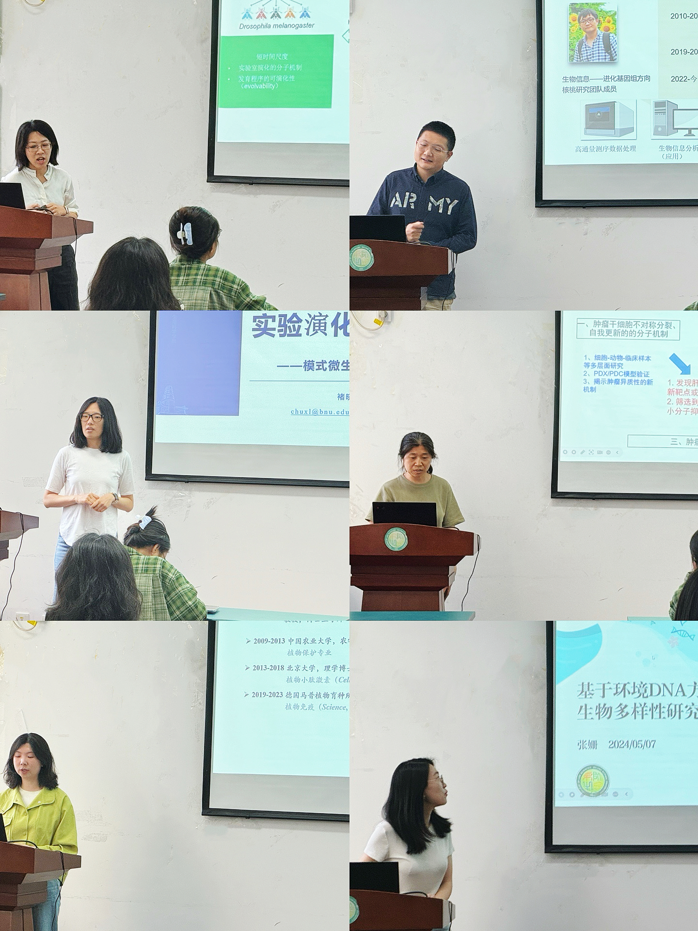 六位青年教师分别就各自的研究领域和成果进行了精彩的介绍。李雪莹博士深入探讨了生物多样性演化的遗传基础,尤其是基因调控在演化过程中的关键作用;张博文博士展示了其在群体基因组学和生物信息学领域的研究成果;褚晓琳博士介绍了种群适应性与种间关系的机制;王彦英博士聚焦于长链非编码RNA与肿瘤生物学的交叉研究;刘莉博士深入探讨了植物激素信号转导和胞外信号交流的机制;张姗博士运用分子生态学和群体遗传学的知识,展示了如何利用环境DNA技术研究生物多样性和群落结构。