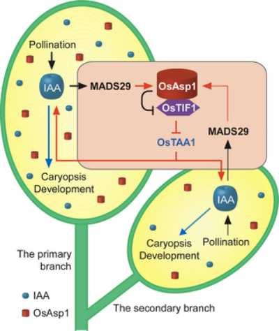 本研究首先利用高通量测序技术结合生物信息学分析手段对水稻开花后四个不同发育阶段(开花后第0、5、12和20天)的初次级颖果材料进行转录组比较分析,采用“存同求异”的基因挖掘策略,发现了三个在水稻初级颖果0天和次级颖果5天特异高表达的关键基因,并对其中一个基因OsAsp1(编码一种天冬氨酸蛋白酶的基因)进行后续研究。水稻T-DNA插入突变体asp1表现出纯合致死及杂合消除了初次级颖果发育差异的发育特征,而且其中一个杂合突变体asp1-1+/–表现出次级颖果发育加快,干重达到初级颖果的水平。进一步研究发现,OsAsp1通过负调控生长素合成基因OsTAA1的转录抑制因子1(OsTAA1 inhibition factor, OsTIF1)的表达,以调控生长素的合成。同时,OsTIF1与OsAsp1存在相互作用,而且IAA通过解除二者互作,并促进OsTIF1从内质网转移到细胞核,反馈调控颖果中IAA水平确保生长素在初次级颖果中的顶端分布优势。最后,我们还发现生长素通过另一转录因子MADS29促进OsAsp1的转录,以维持开花当天OsAsp1在初级颖果中的高表达。由此,我们提出了生长素-MADS29-OsAsp1/OsTIF1-OsTAA1-生长素的调控模型以调控生长素在初次级颖果中水平差异以维持初次级颖果发育差异的新模型。