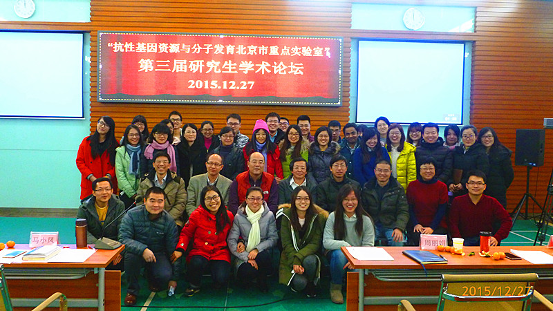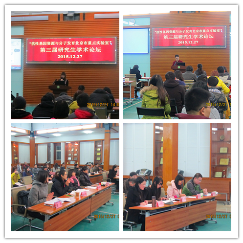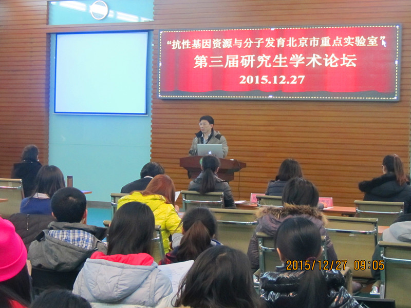 2015年12月27日,抗性基因资源与分子发育北京市重点实验室第三届研究生学术论坛在生科院多功能厅顺利举行,来自重点实验室的老师和60多名研究生参加了本次学术论坛,论坛由许鹏飞、王琪媛两位研究生主持。