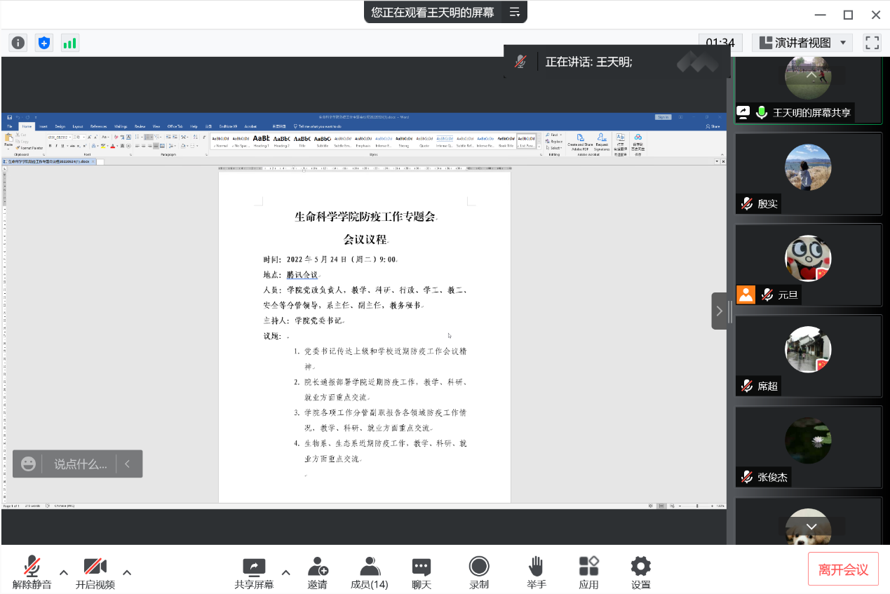 接着,学院各项工作分管副职、院长助理和本研教务秘书分别介绍了各领域近期工作开展情况,重点介绍了针对落实疫情防控要求所做的具体举措。生物系、生态系主任、副主任分别介绍了两个系近期教学、科研工作进展和疫情防控期间师生整体情况,重点就校园封闭管理期间实验室管理细节和期末、毕业期间具体安排与相关负责人进行了沟通协调。