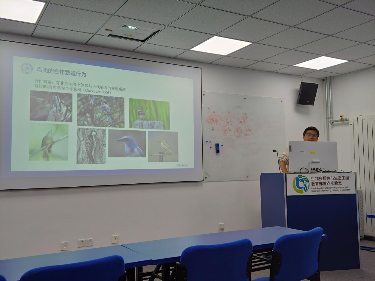 2023年10月15日晚,伟德国际1946bv官网第三期“研究生交流论坛”在生态楼A105室顺利开展。生态学2023级博士研究生胡志清为大家带来了论坛汇报——董寨“菜鸟”的合作之旅。胡志清首先分享了硕士阶段的工作《黑脸噪鹛与红嘴蓝鹊的繁殖生态研究》。他将目光聚焦于鸟类合作繁殖研究上,提出了科学问题:两种合作繁殖鸟类的合作繁殖行为是否会对繁殖成功有积极影响?胡志清从繁殖监测、基础繁殖参数、帮助者的作用三个方面讲述了他的研究结果。许多同学对感兴趣或有疑问的内容举手发问,胡志清一一作了详细的解答。