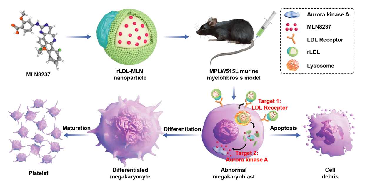 原发性骨髓纤维化(Primary myelofibrosis,PMF)是一种高侵袭性的骨髓增殖性肿瘤,以低分化巨核细胞和进行性骨髓纤维化为主要特征。靶向极光激酶A (Aurora kinase A,AURKA)的小分子抑制剂MLN8237已被批准用于高危PMF患者的分化治疗,但其脱靶副作用导致部分患者的治疗失效和严重并发症。在此,杨琼教授课题组报道了一种双靶向治疗药物rLDL-MLN,在PMF疾病的分化治疗中具有巨大的临床转化潜力。在rLDL-MLN中,重组的低密度脂蛋白(rLDL)纳米载体和负载的MLN8237可以分别靶向LDL受体和细胞内AURKA,从而靶向恶性造血干/祖细胞(Hematological stem/progenitor cells,HSPCs)。与游离MLN8237相比,rLDL-MLN有效抑制PMF细胞系和异常HSPCs的增殖并显著诱导其分化,阻止异常HSPCs形成红细胞和巨核细胞集落。当MLN8237剂量低于其临床试验剂量1500倍时(0.01 mg/kg),rLDL-MLN仍然表现出更有效的治疗效果,PMF小鼠几乎清除了肿瘤细胞。同时,rLDL-MLN在有效剂量下能促进造血恢复,无毒副作用,在PMF患者的靶向分化治疗中有很大的前景。