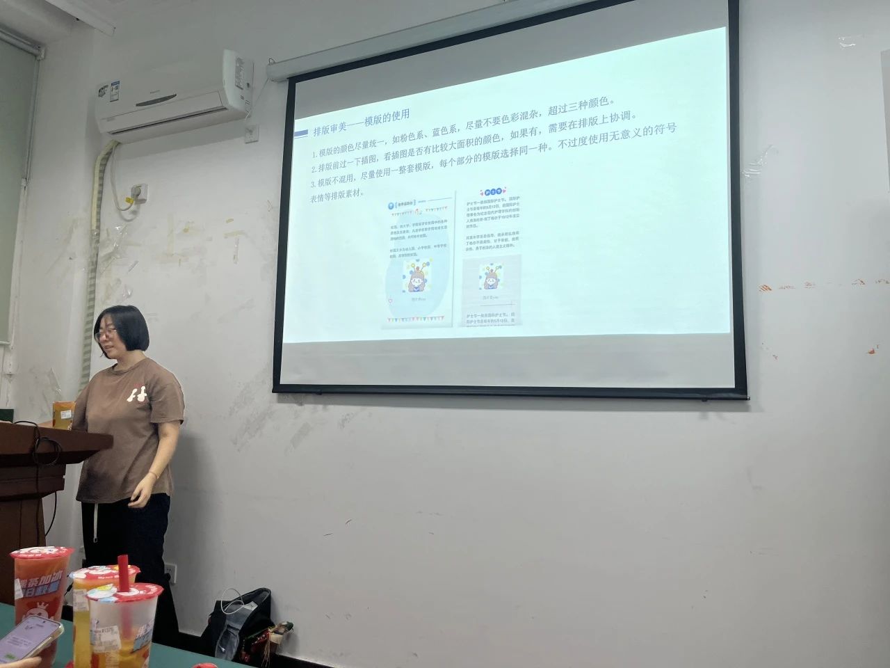 最后,曹佳鑫对排版规范以及排版审美进行了着重说明。她逐条讲解了融媒体中心制定的排版规范,包括图文格式和用语规范等内容。她也指出要注意排版模板的使用,模板风格应尽量统一,做到色彩协调,图文分布合理,要注意避免新闻推送模版过于花哨,校园推送过于死板等。她建议同学们可以多阅读排版优秀的公众号积累审美。